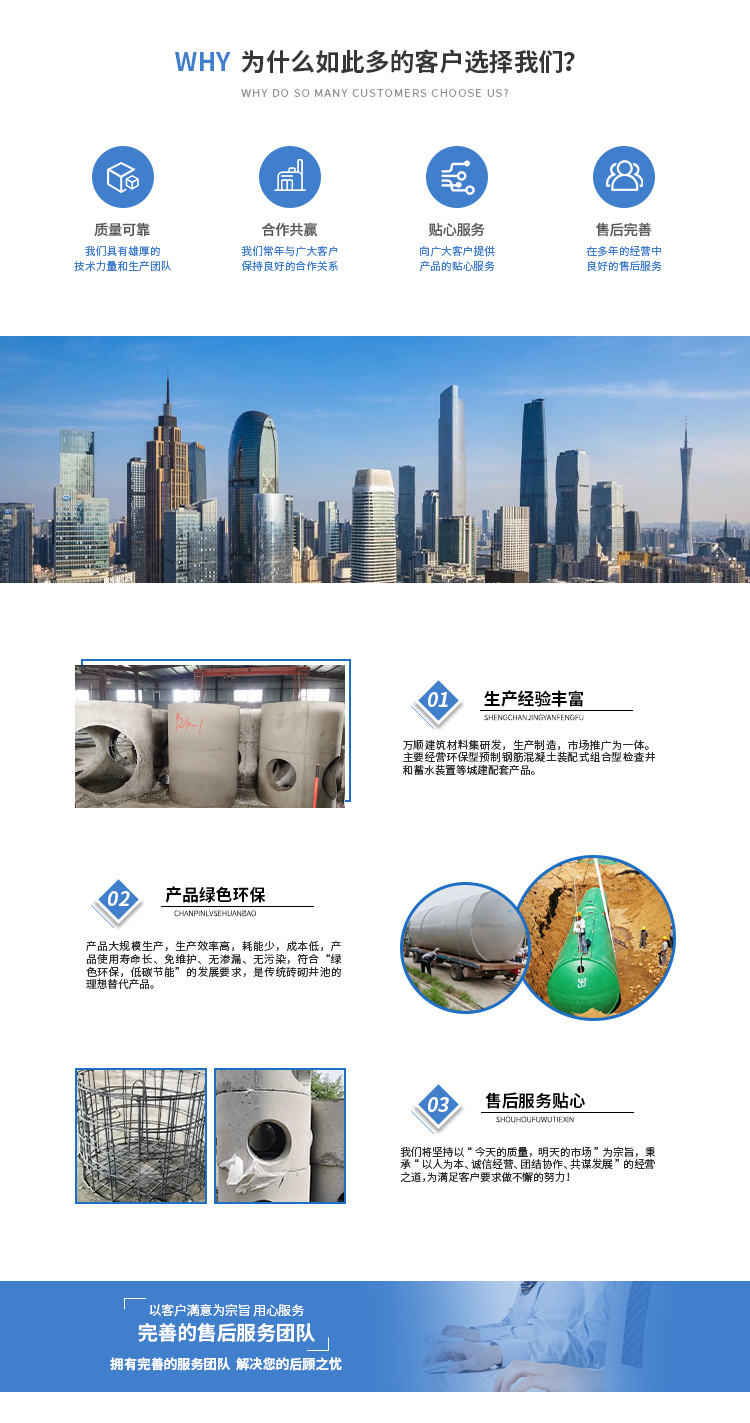 黃山市萬順建筑科技有限公司是集研發(fā),生產(chǎn)制造,市場推廣為一體的綜合性企業(yè)。公司主要經(jīng)營環(huán)保型預(yù)制鋼筋混凝土裝配式組合型檢查井和蓄水裝置等城建配套產(chǎn)品。產(chǎn)品生產(chǎn)過程采用獨特的生產(chǎn)工藝,機械化流水作業(yè)。產(chǎn)品大規(guī)模生產(chǎn),生產(chǎn)效率高,耗能少,成本低,產(chǎn)品使用壽命長、免維護、無滲漏、無污染,符合“綠色環(huán)保,低碳節(jié)能”的發(fā)展要求,是傳統(tǒng)磚砌井池的理想替代產(chǎn)品。